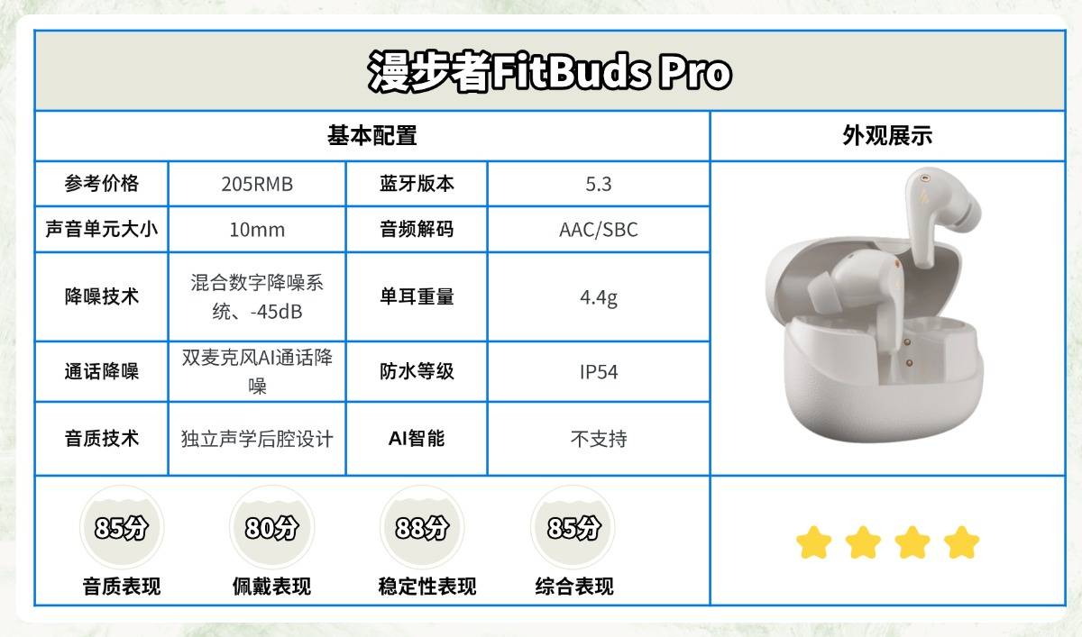 此外,随附的耳套抗菌率达到99.9%,细致守护耳道健康,体现出对用户关怀的周到考量。总体来看,漫步者FitBuds Pro在性能配置与价格之间取得了优秀平衡,是一款适合学生与职场人士日常使用的实用之选。