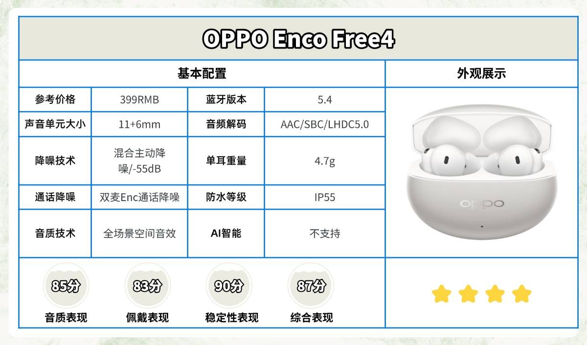 OPPO Enco Free4沿袭品牌经典设计语言,机身线条圆润流畅,单耳重量仅4.7克,佩戴轻盈稳固。耳塞选用亲肤材质打造,短时佩戴几乎无感,整体做工精致细腻,延续了OPPO高端产品的一贯质感。