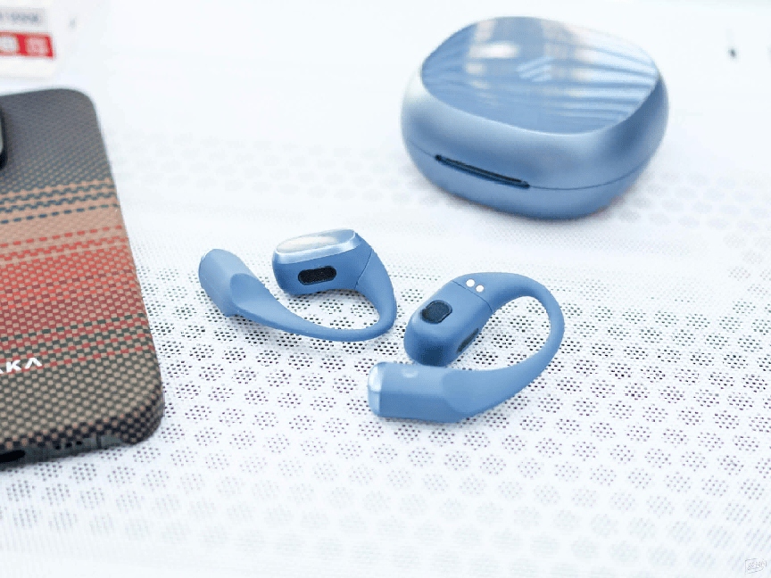 佩戴方面,单耳重量约9.8克,内置镍钛记忆金属骨架,可根据不同耳形自适应调整,保持稳固贴合。耳机表面采用柔软硅胶材质,长时间佩戴压迫感较弱,但因重心略向前倾,偶有轻微松动感。