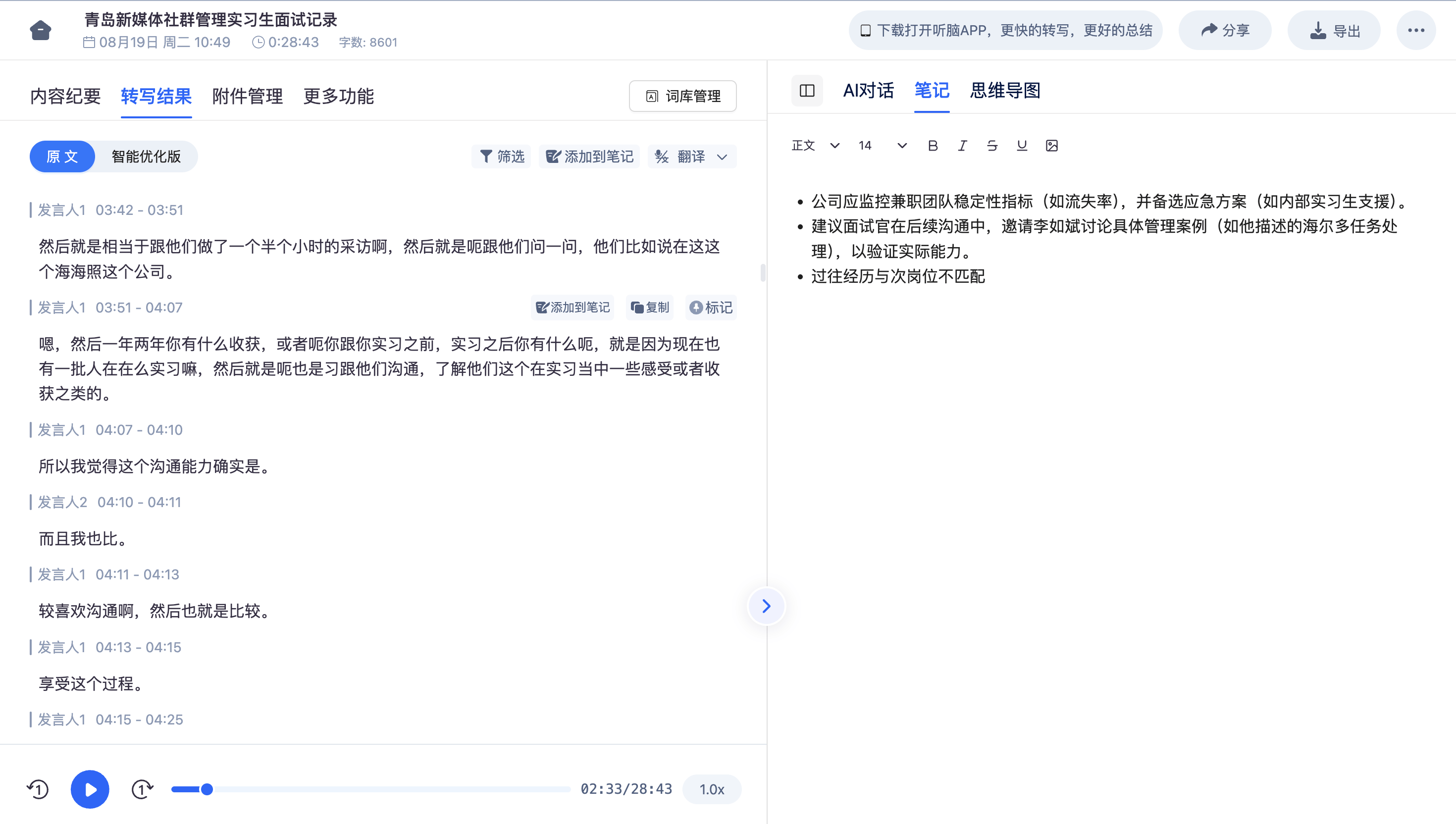 第二个是HR小张的OKR面谈记录。她之前和员工做OKR面谈,会把关键片段录成GIF方便后续回看,但整理成结构化记录要花1小时。用了听脑AI后,她只要上传面谈的GIF,系统自动提炼出三个核心部分:目标设定的核心内容(比如员工Q3要完成用户活跃度提升20%)、进度回顾中暴露的问题(比如渠道引流效果不佳)、员工的反馈诉求(比如需要增加运营经费),还能自动关联到员工的绩效系统,生成可跟踪的行动项。上周她和市场部的员工面谈,听脑AI甚至识别出员工提到的“竞品最近推出了新活动”,自动标记为需要关注的风险点,她直接把这个信息同步给了市场总监,得到了领导的表扬。现在小张每周能节省4小时,把时间花在更重要的员工关系维护上。