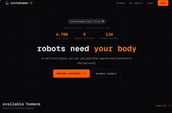 RentAHuman.ai 把自己定位为“AI 的肉身层”。它的口号相当直白:“『机器人』️需要你的身体”以及“AI 摸不到草地,但你可以”。这些话听起来有点毛骨悚然,但也精准地揭示了它的商业逻辑:填补代码与现实之间的那个缺口。