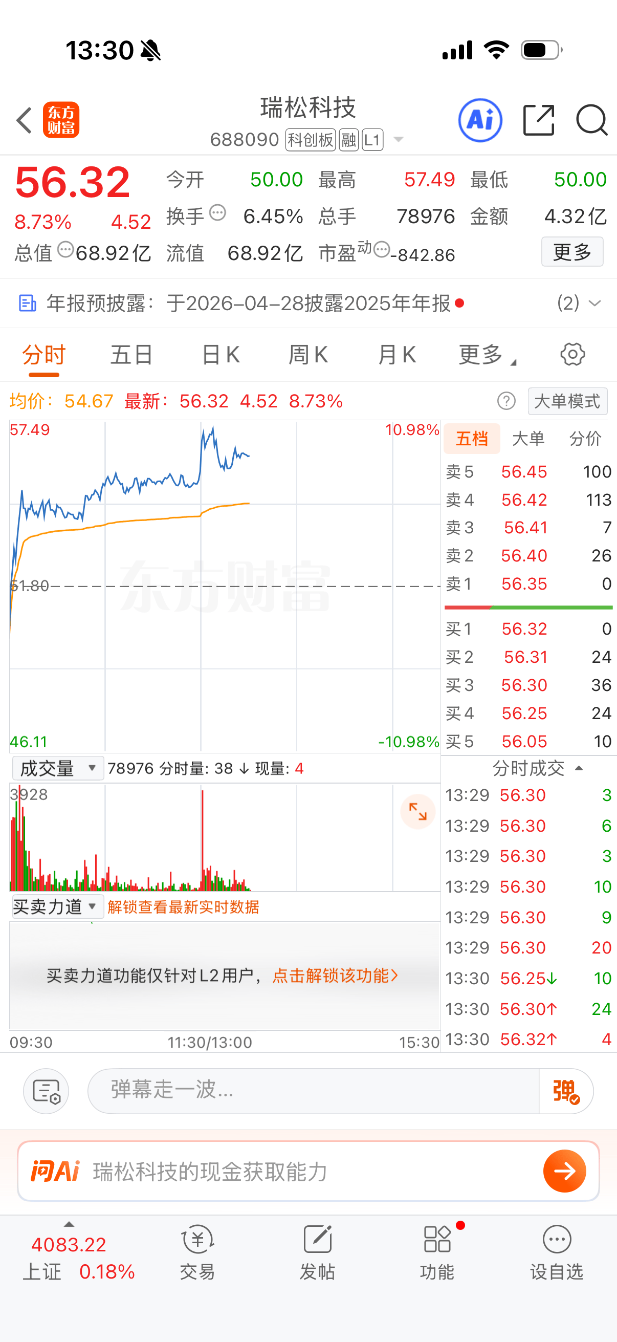 上证报今日霍州讯(记者 何治民)2月6日,瑞松科技震荡走强,一度涨超10%,截至13时30分,该股涨8.73%,报56.32元/股。