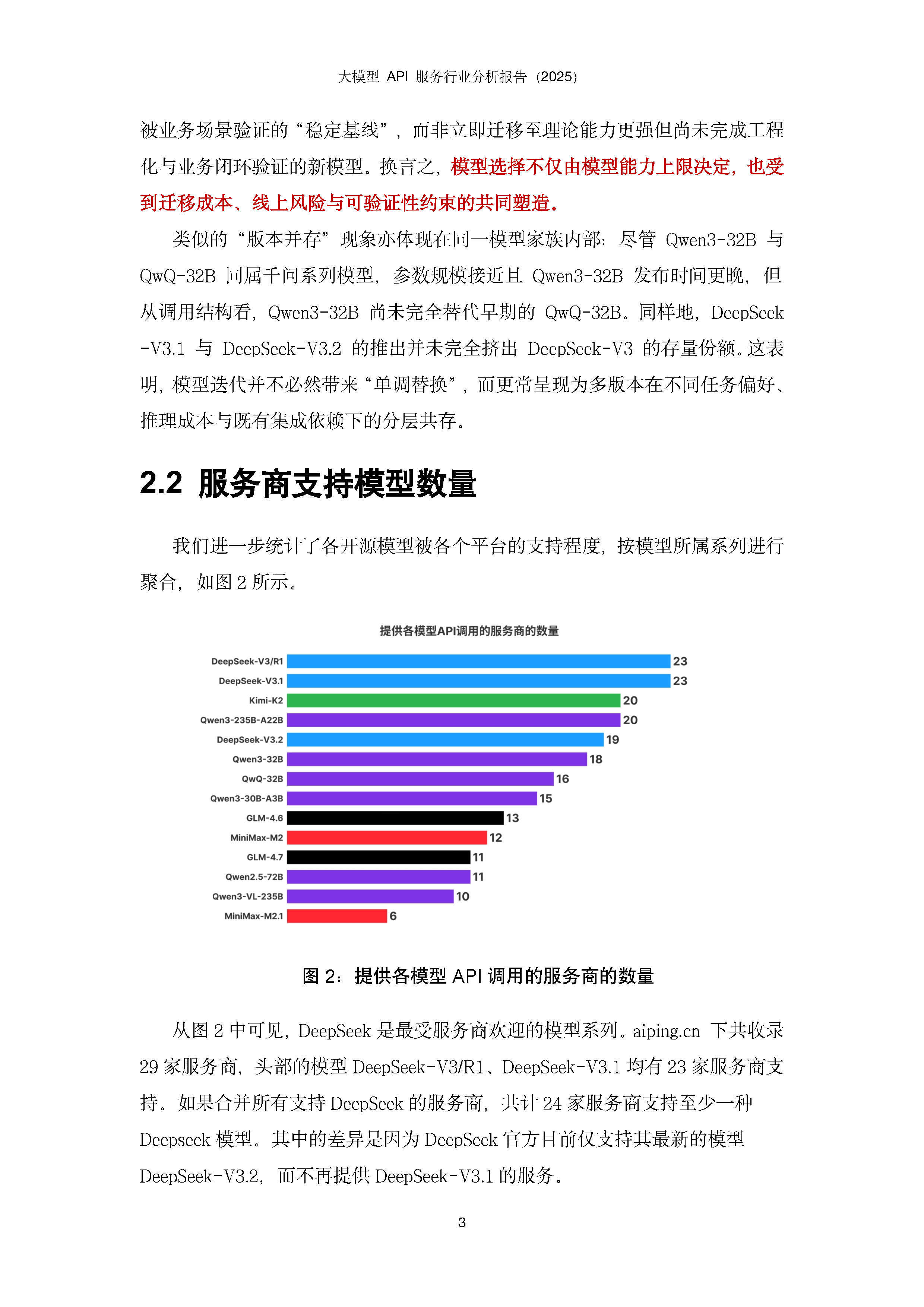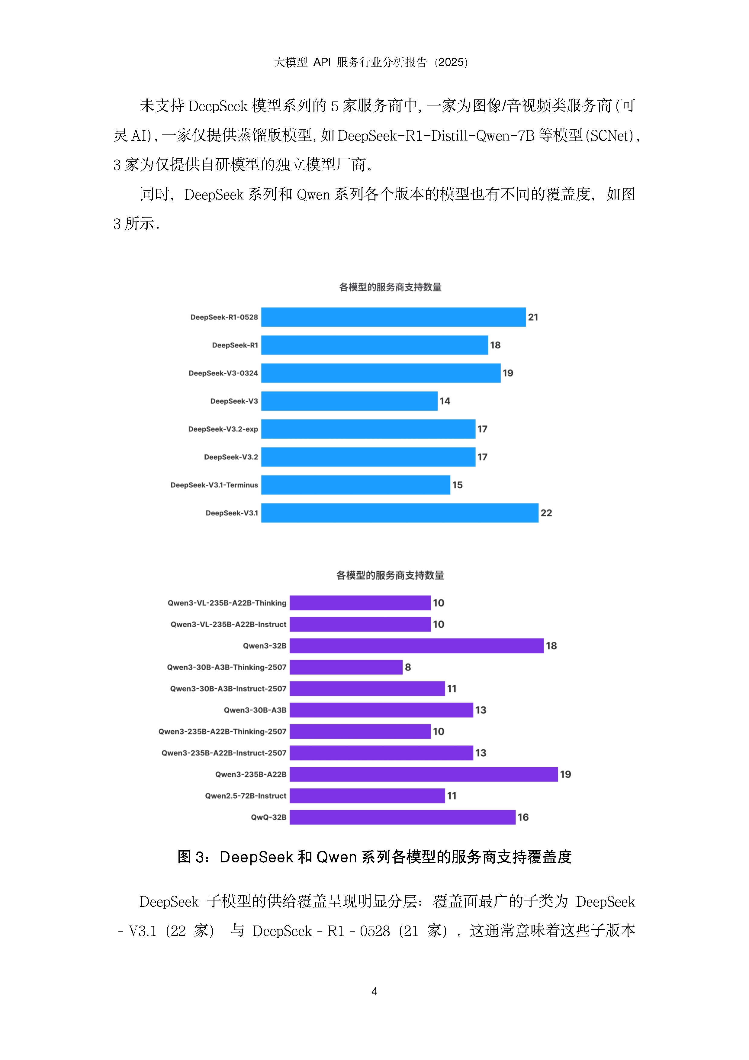 从服务商对模型的支持情况来看,『DeepSeek』 系列最受青睐。AI Ping 收录的 29 家服务商中,23 家支持 『DeepSeek』-V3/R1 与 『DeepSeek』-V3.1,24 家支持至少一种 『DeepSeek』 模型。未支持 『DeepSeek』 模型的 5 家服务商中,1 家为图像,音视频类服务商,1 家仅提供蒸馏版模型,3 家为仅提供自研模型的独立厂商。『DeepSeek』 子模型供给呈现明显分层,V3.1与 R1-0528覆盖最广,因其生态可移植性与市场可预期性更强;而 V3与 V3.1-Terminus覆盖度较低,受 “旧版本,特定分支” 的生命周期与产品定位约束。