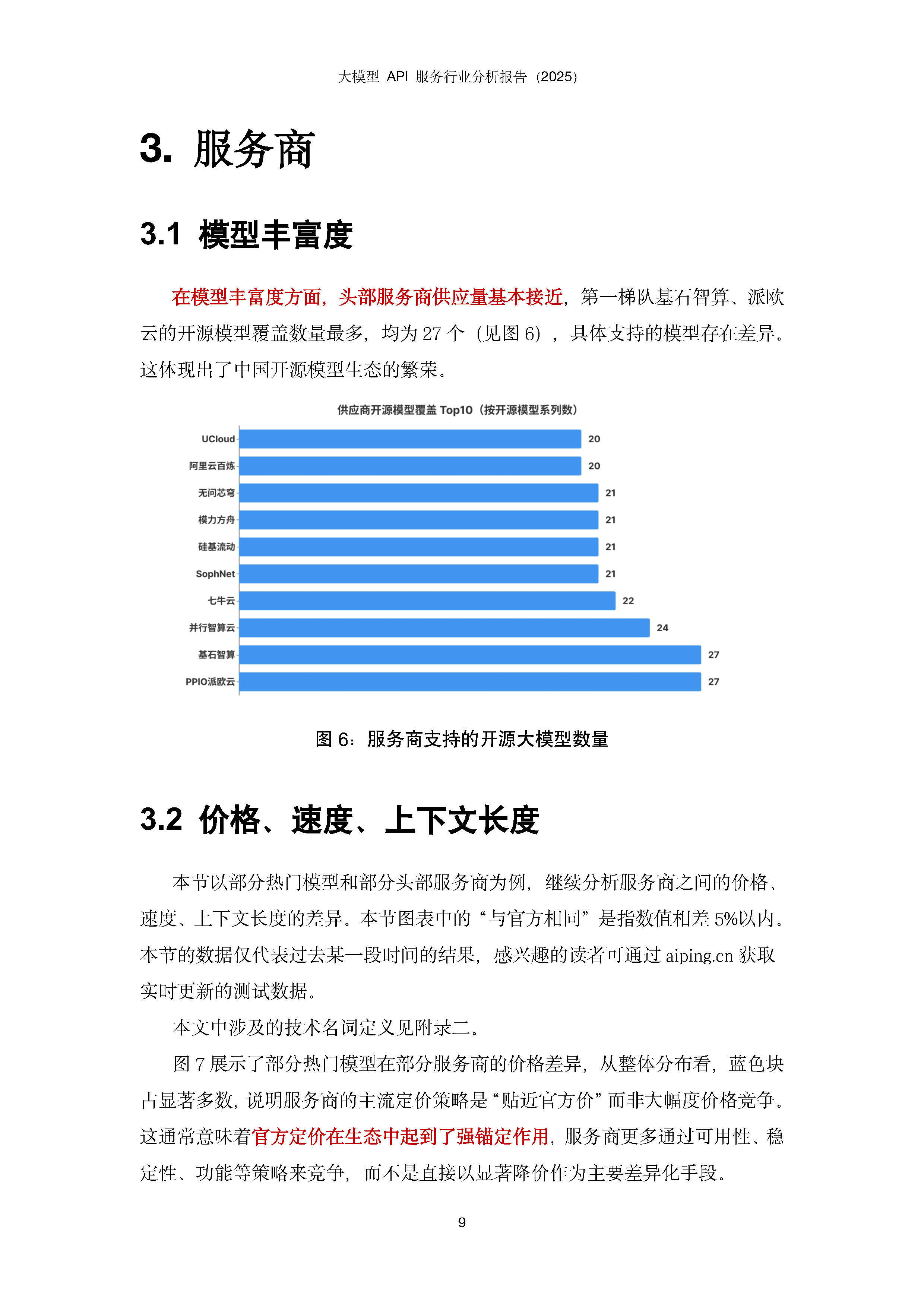 在服务商竞争层面,行业格局也逐渐清晰。模型丰富度上,头部服务商供应量基本接近,基石智算与派欧云的开源模型覆盖数量最多,均为 27 个,体现出中国开源模型生态的繁荣。价格方面,服务商主流策略是 “贴近官方价”,多数服务商定价与官方价格差异在 5% 以内,官方定价成为生态强锚点,服务商更多通过可用性、稳定性等方面竞争,而非大幅降价。