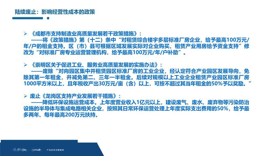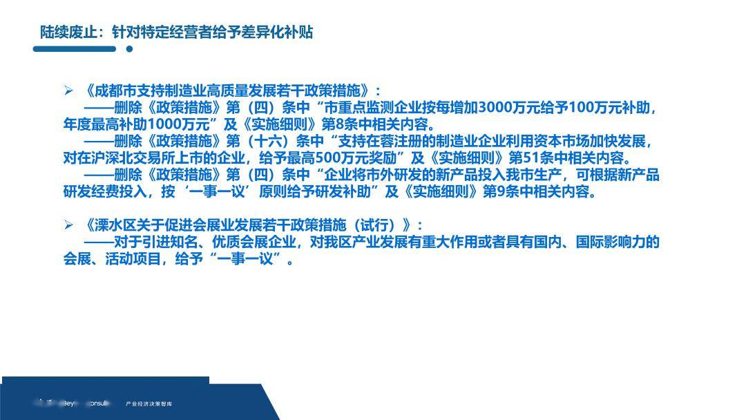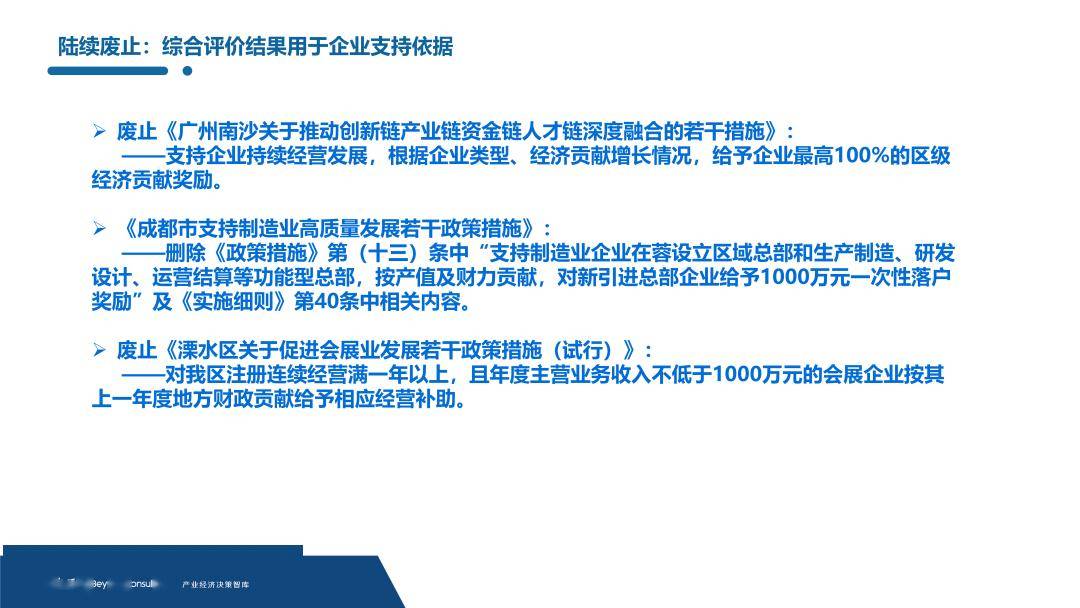 近期多地已展开政策清理与调整,集中体现在逐步取消或修改带有地方保护色彩的补贴与奖励措施。例如,成都市删除对制造业企业增量营收补助、上市奖励及高端人才奖励条款;广州南沙区废止高层次人才及经济贡献高额奖励;溧水、崇明、龙岗等地也相继清理会展、租金、环保运营等专项补贴。未来,针对固定资产投资补贴、园区租金减免等“经营成本支持类”政策预计也将逐步收紧,推动政策体系回归“有效市场+有为政府”的协同轨道。