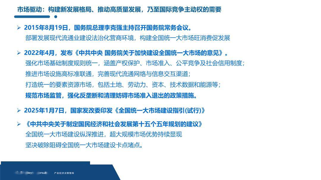 全国统一大市场建设正进入纵深推进的关键阶段。自2022年《中共中央 国务院关于加快建设全国统一大市场的意见》发布以来,国家着力强化市场基础制度规则统一、推进市场设施高标准联通、打造统一的要素资源市场,并持续规范市场监管、清理妨碍公平竞争的政策措施。2025年《全国统一大市场建设指引(试行)》进一步明确路径,旨在坚决破除市场建设的“卡点堵点”,释放超大规模市场潜力。