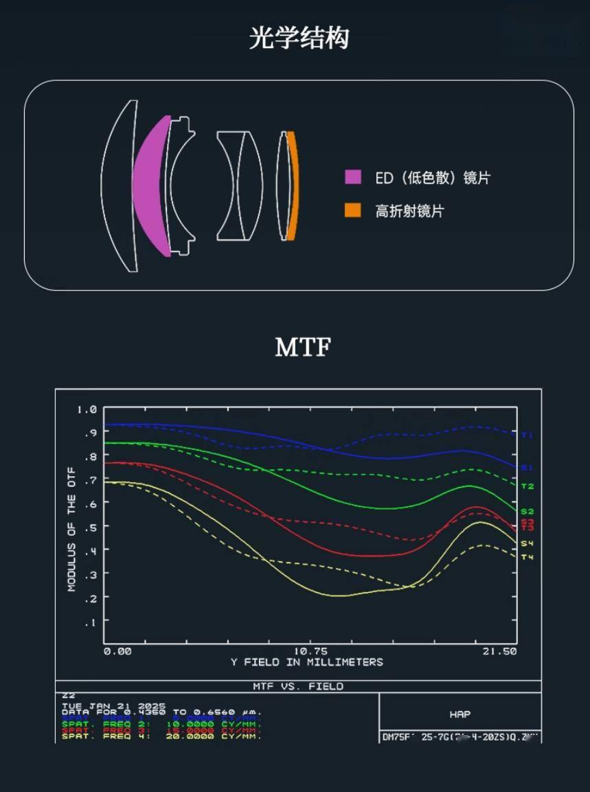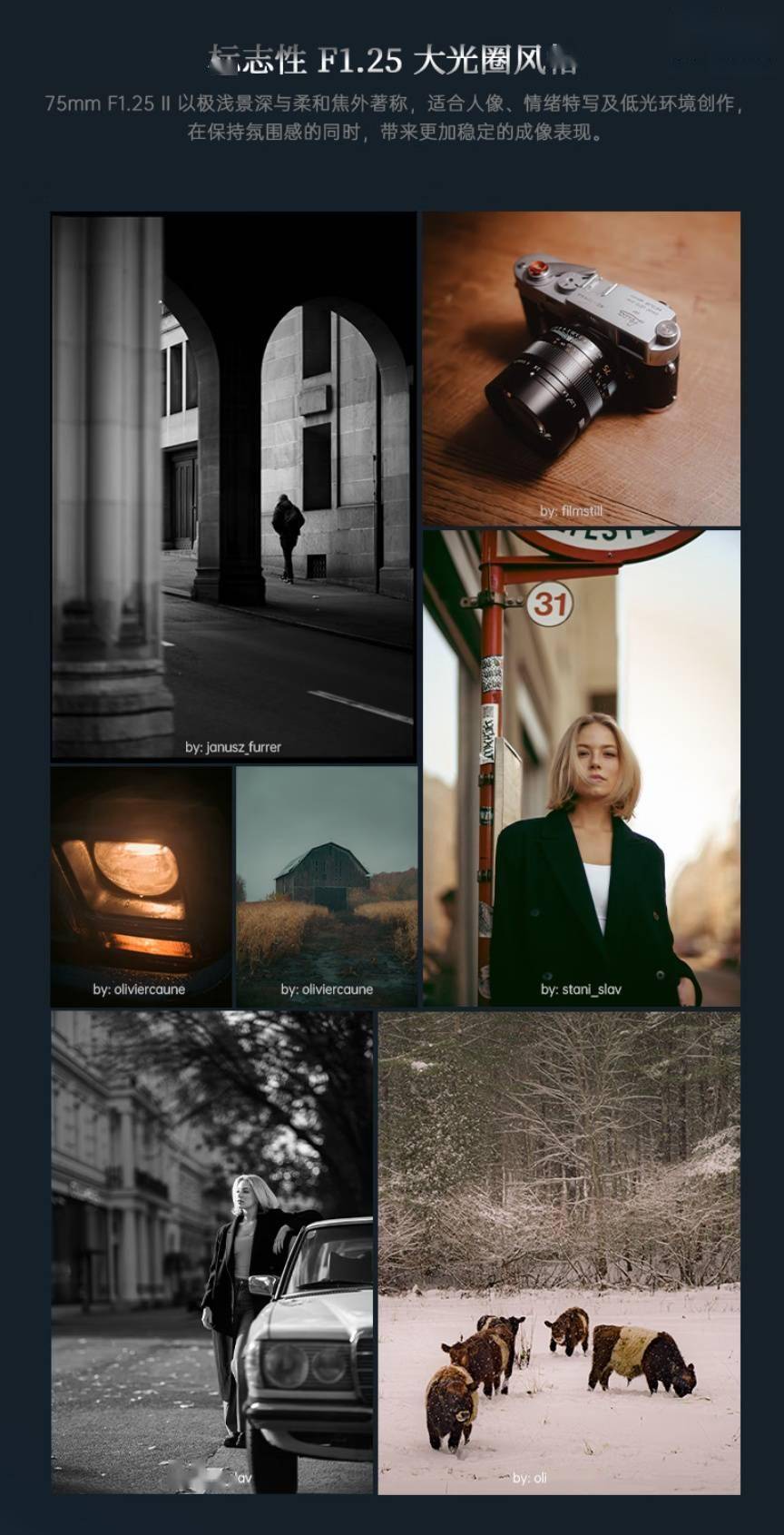 据介绍,这款镜头的最大光圈可达 f/1.25,75mm 的焦距适合人像、情绪特写以及低光环境创作,可在交代主体的同时保持一定氛围感,采用 6 组 7 片的光学结构,带有 1 枚 ED(低色散)镜片以及 1 枚高折射镜片。