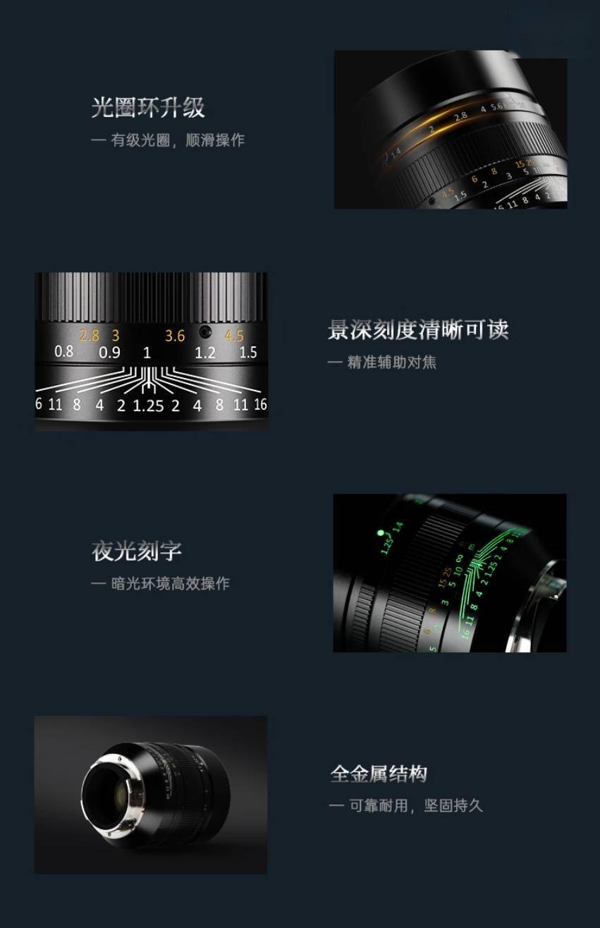 规格方面,这款镜头只支持手动对焦,最近对焦距离 0.8m,内置 12 片光圈叶片,可带来更加圆润的光斑效果,重量 514g,镜身的焦距、光圈环带有夜光刻字效果,可在暗光环境下高效创作,升级有级光圈环,阻尼更加顺滑。