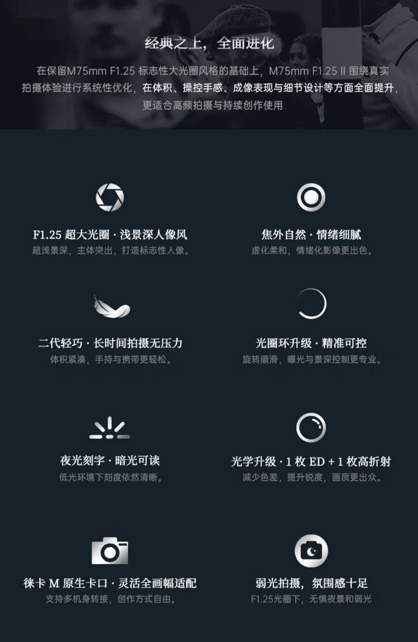2 月 6 日消息,七工匠现已发布 M 75mm f/1.25 II 全画幅手动镜头,新品主打柔和焦外、夜光刻字,适配徕卡 M 卡口,售价 2290 元。