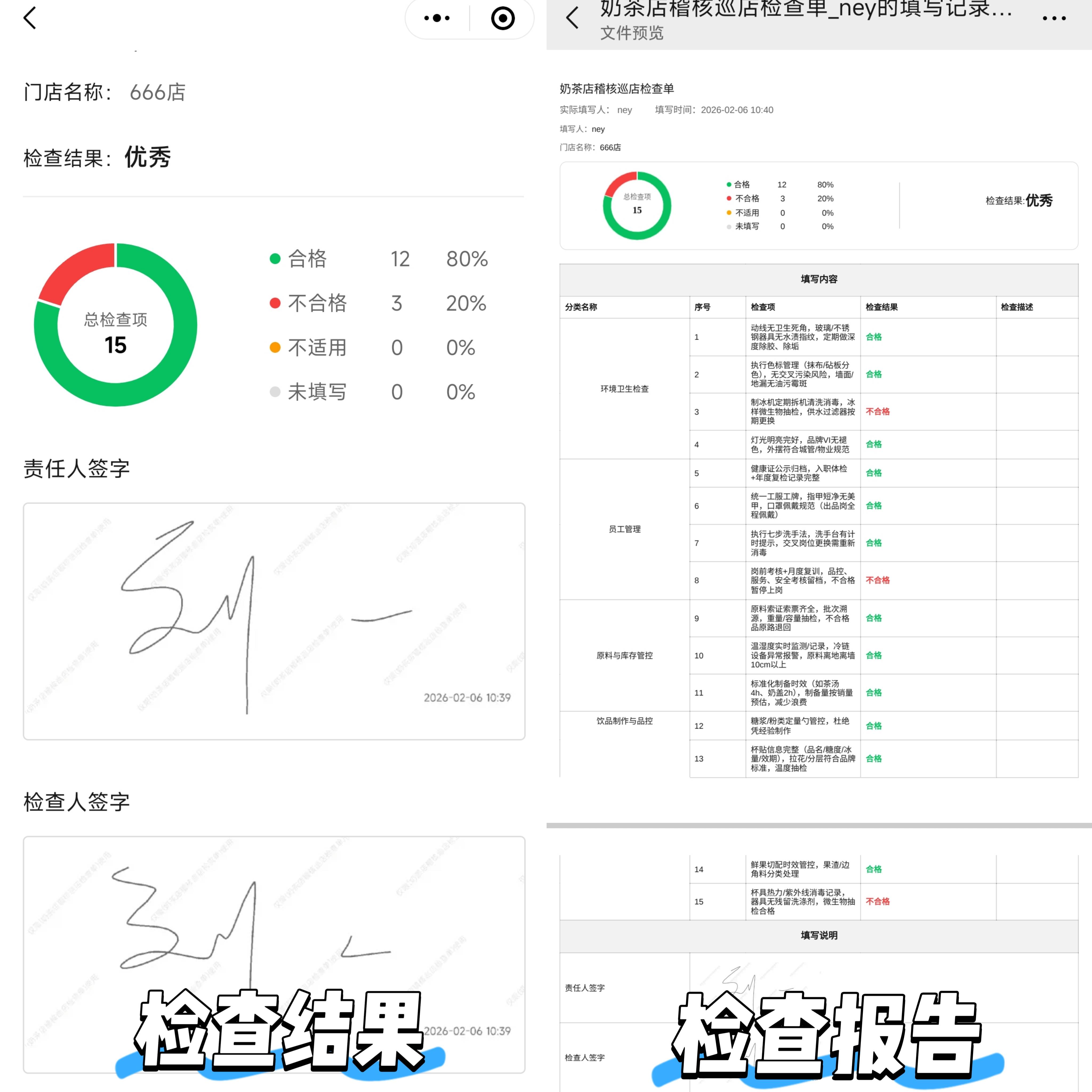 照片会自动带上时间、地点、门店信息的水印,而且没法修改,彻底杜绝事后补拍、弄虚作假。每一次检查都能追根溯源!管理者在企鲸小程序里能实时看各店检查结果,还能一键下载报告,超方便。