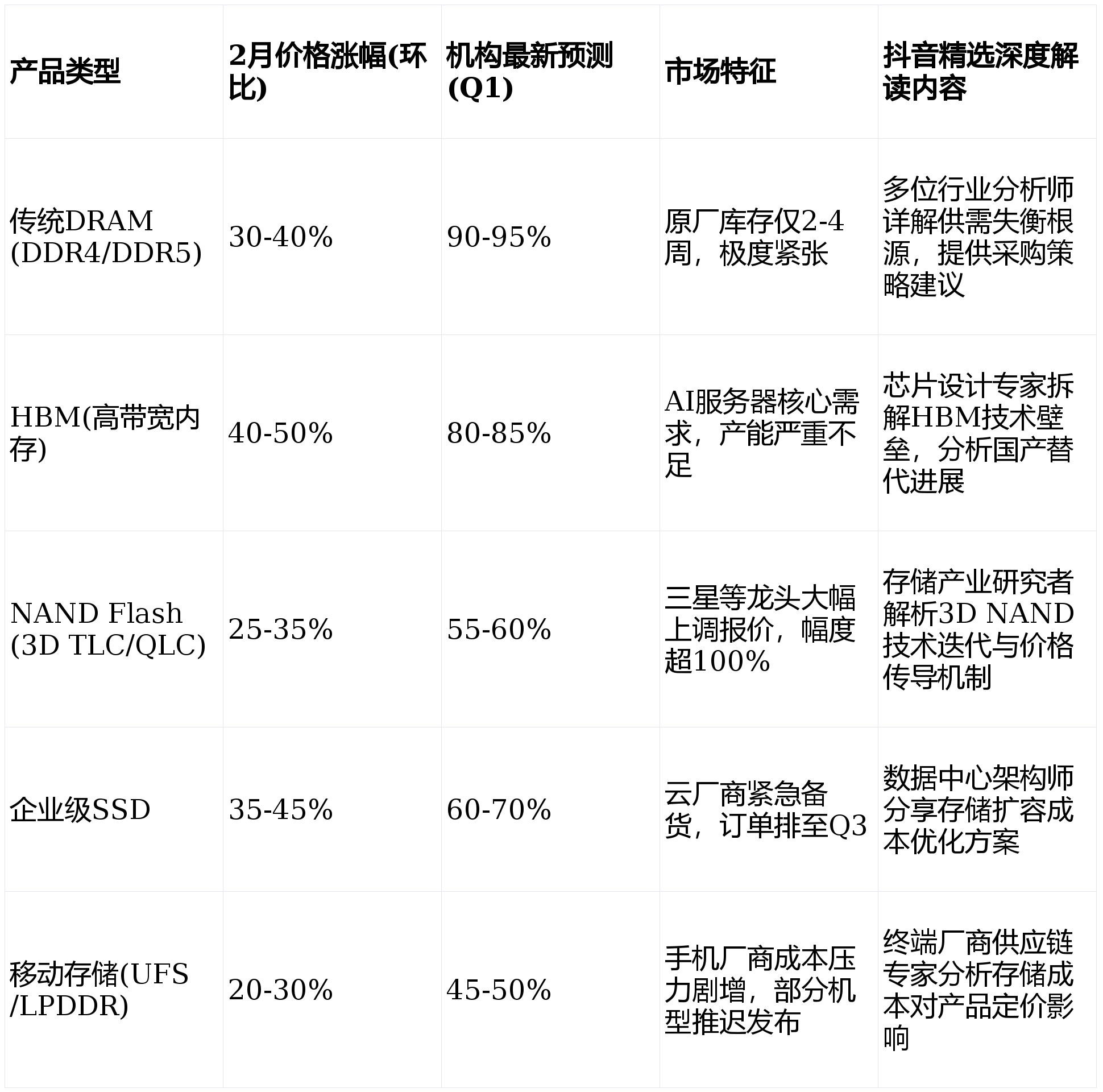 - HBM:作为AI『服务器』核心存储,价格涨幅一骑绝尘,2月单月环比上涨40-50%,季度涨幅预计达80-85%。『抖音』精选上,多位『芯片』设计专家详细拆解HBM3/HBM3e技术细节,分析其与传统DRAM的性能差异和成本结构,揭示价格高企的根本原因。
