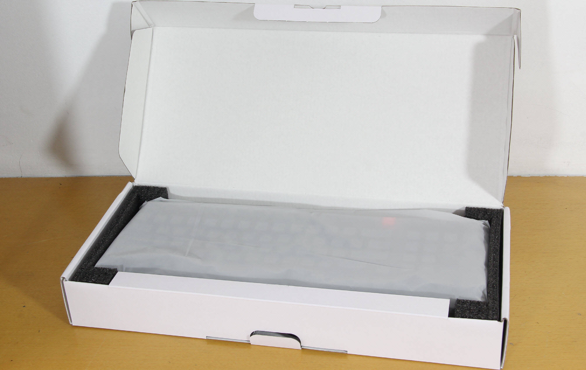 拆开内层包装,首先看到的是一层透明的防尘塑料膜,将键盘整体包裹得严严实实,有效防止了键盘表面沾染灰尘和指纹,保持了产品的洁净度。揭开防尘膜后,我们就能看到微星FORGE GK500 WIRELESS暗夜三模机械键盘的本体,静静地放置在定制的泡沫凹槽中,泡沫凹槽的尺寸与键盘完美贴合,能够在运输过程中为键盘提供全方位的缓冲保护,避免因震动导致键盘损坏。