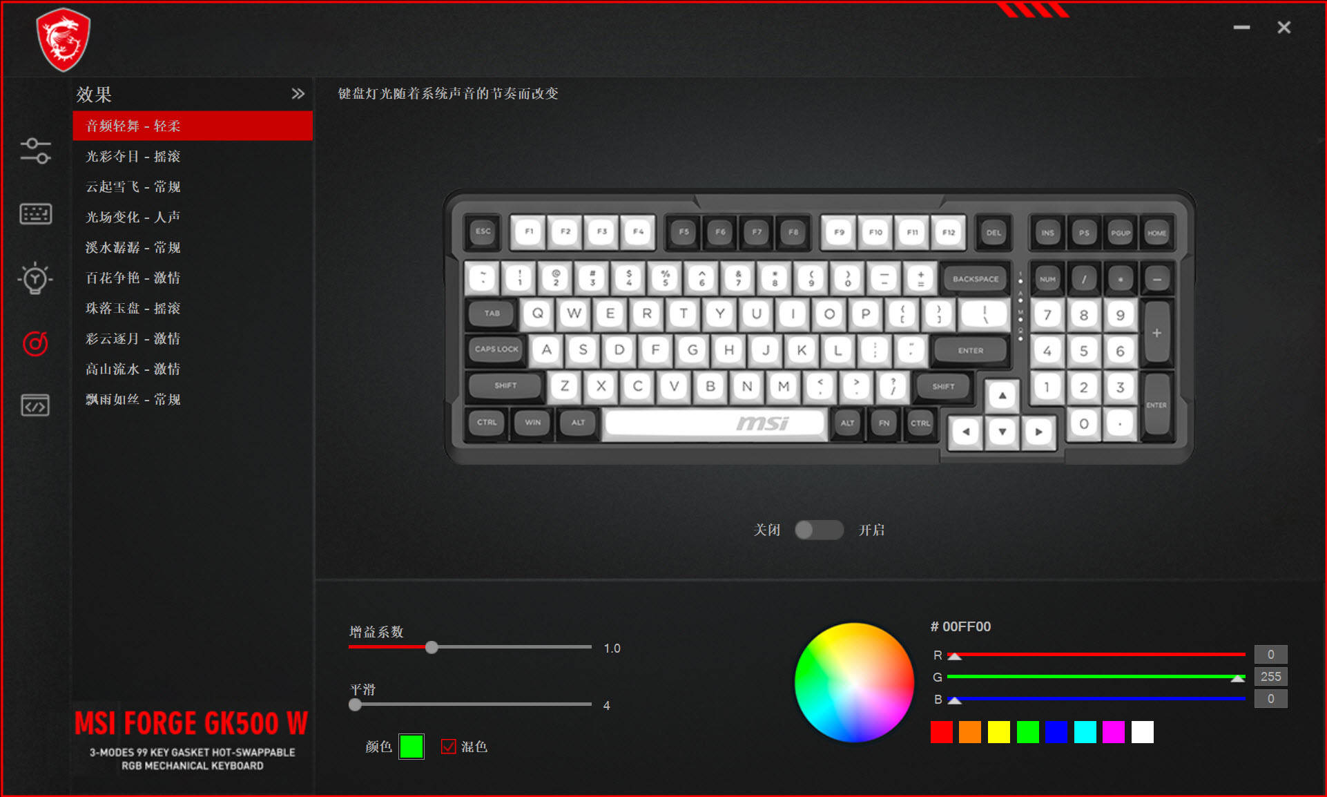 对于机械键盘来说,RGB灯效不仅是颜值的加分项,还能提升使用体验,尤其是对于电竞玩家来说,炫酷的RGB灯效能够营造出更加浓郁的电竞氛围,让游戏体验更加沉浸式。微星作为电竞外设大厂,在RGB灯效的设计上一直有着独到的优势,这款微星FORGE GK500 WIRELESS暗夜三模机械键盘,自然也配备了高品质的RGB多彩灯效,支持约1680万色RGB灯光,内置多种灯效模式,既能满足用户对颜值的追求,也能适配不同的使用场景,让键盘不再是单调的输入工具,而是成为桌面的“颜值担当”。