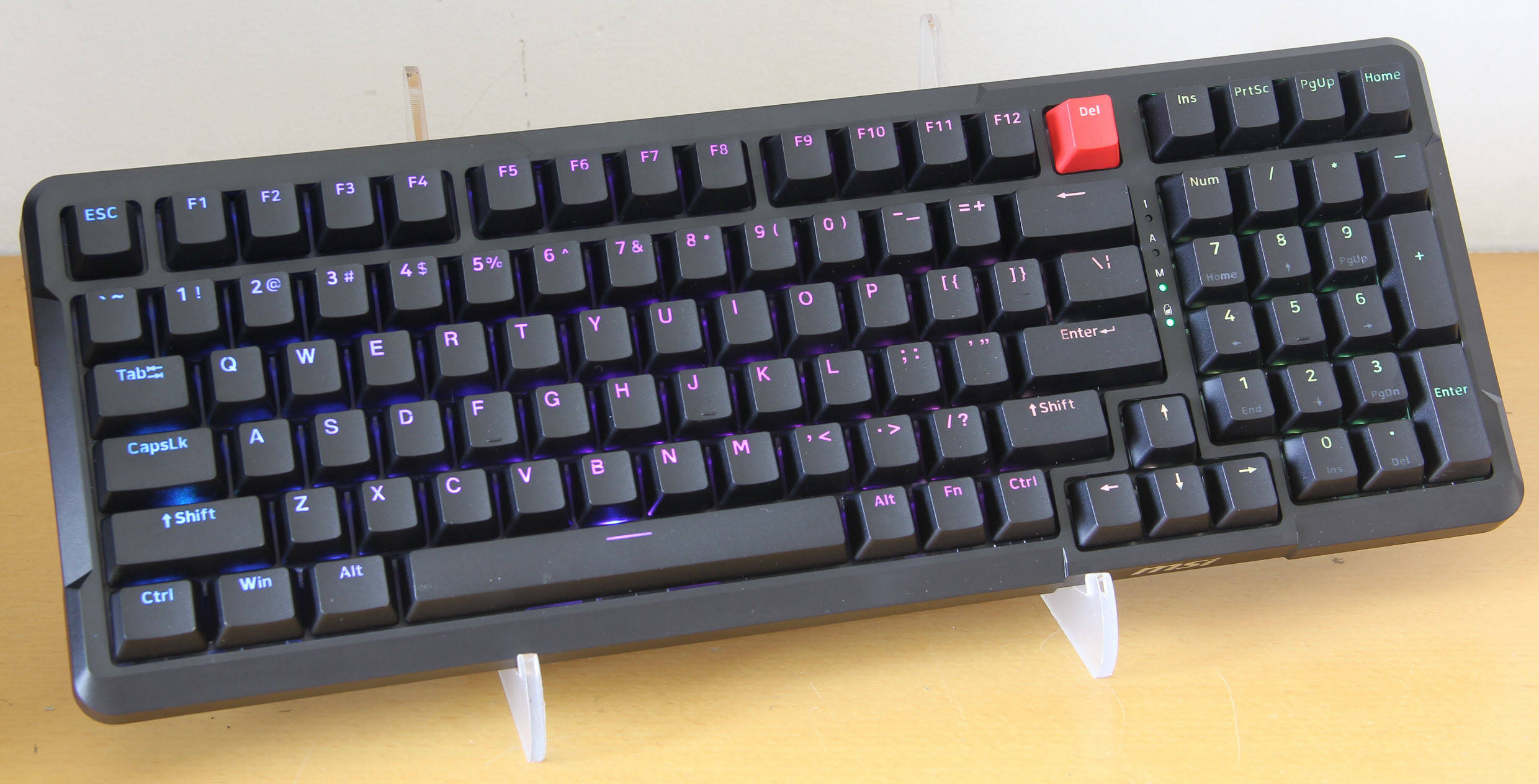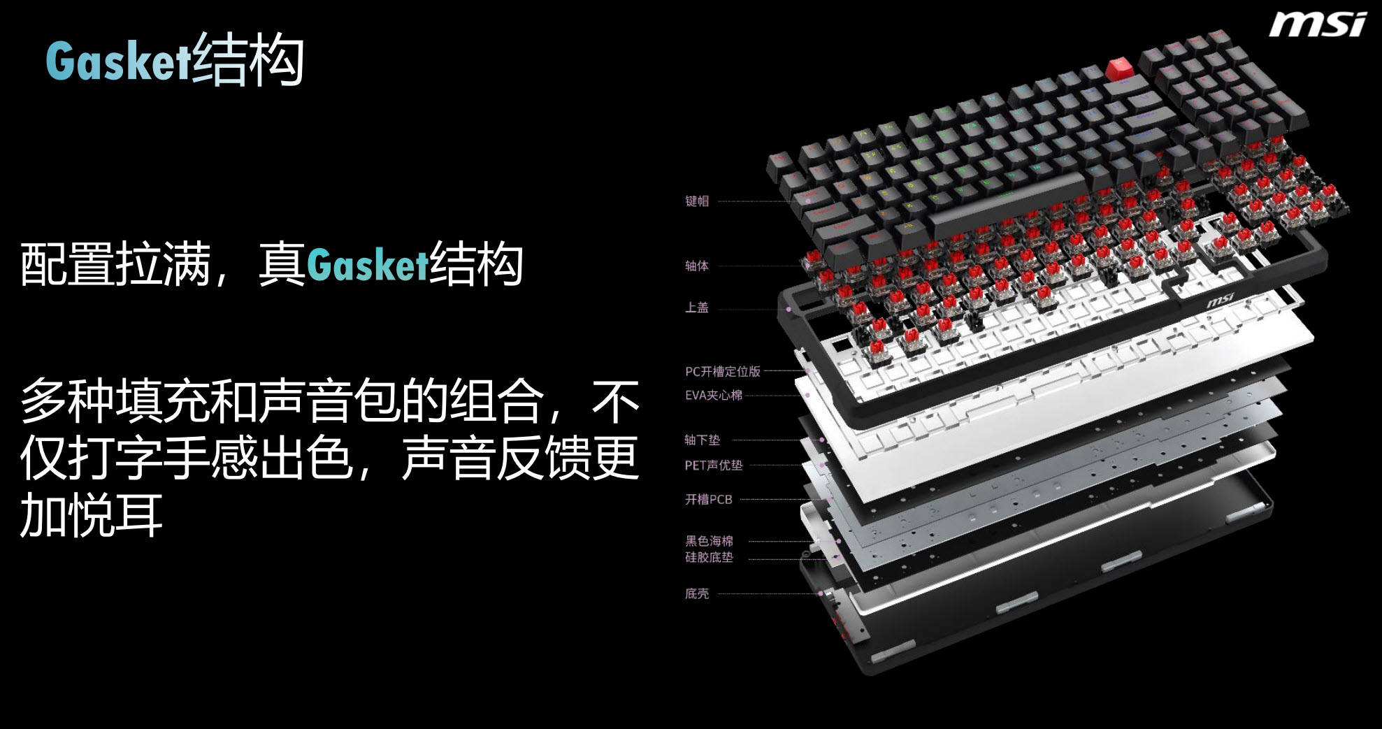 其中,青轴轴体采用了清脆的段落式设计,触发压力适中,按压时会发出清脆的“咔嗒”声,反馈感清晰,打字节奏感十足,适合喜欢清脆手感和声音的用户,无论是打字还是游戏操作,都能带来强烈的沉浸感;红轴轴体采用了线性轴设计,触发压力较轻,按压顺畅无段落感,回弹迅速,手感细腻顺滑,长时间使用不易疲劳,适合需要长时间打字的办公人群和追求流畅操作的游戏玩家定制轴体与键盘的Gasket结构完美适配,进一步提升了键盘的手感和声音反馈,让每一次击键都更加舒适、悦耳。对于注重手感的用户来说,这款微星定制轴体无疑是一大亮点,在亲民价位段就能享受到定制轴体带来的独特体验,性价比极高。