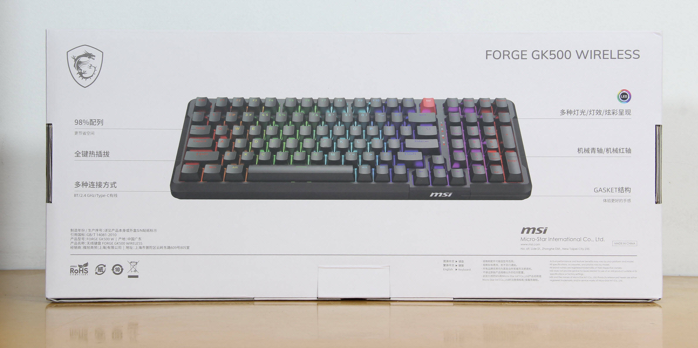 包装正面居中位置,清晰印有微星FORGE GK500 WIRELESS暗夜三模机械键盘的完整实物图,能够让用户直观看到产品的整体外观,上方左侧是微星的品牌Logo,右侧则是RGB图标。背面则标注了键盘的核心卖点——“三模无线🛜、RGB背光、Gasket结构”,关键信息一目了然,方便用户快速get产品核心优势。