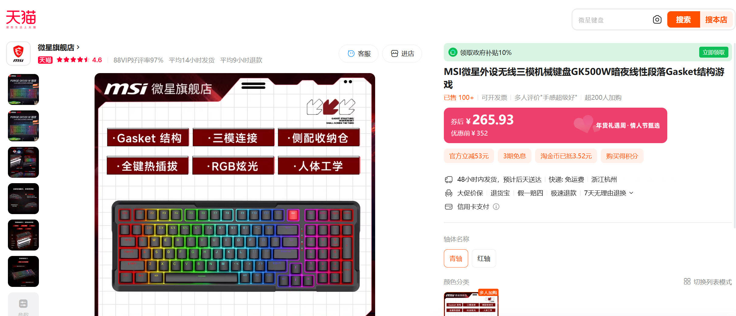 微星FORGE GK500 WIRELESS暗夜三模机械键盘原价352元,如今直降7.5折仅售265元,相当于立省87元!这款98%配列、全键热插拔、支持有线/2.4GHz/蓝牙三模连接的高能键盘,不仅搭载段落感清晰的青轴或顺滑线性的红轴,还拥有RGB灯效与长达一个月的续航表现。在保留旗舰级体验的同时,以入门级价格入手,性价比爆棚——这样的折扣力度,堪称年度入手良机,错过难再遇!