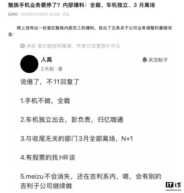同时,网上流传出一份星纪魅族内部员工的爆料,其中透露了五条关于公司业务调整的重磅消息: