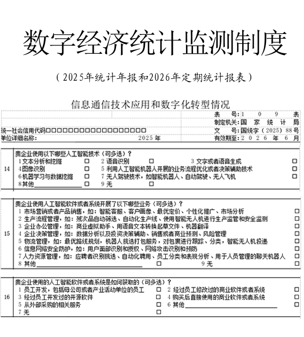 目前,我国在统计领域专门针对人工智能进行监测的制度是《数字经济统计监测制度》。该制度下的《信息通信技术应用和『数字化』转型情况》(109表)设有三项涉及人工智能技术的指标,分别为第14、15、16项。