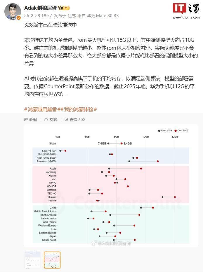 博主表示,AI 时代各家都在逐渐提高旗下手机的平均内存,以满足端侧算法、模型的部署需要。依据 CounterPoint 最新公布的数据,截止 2025 年底,华为手机以 12GB 的平均内存位居世界第一。