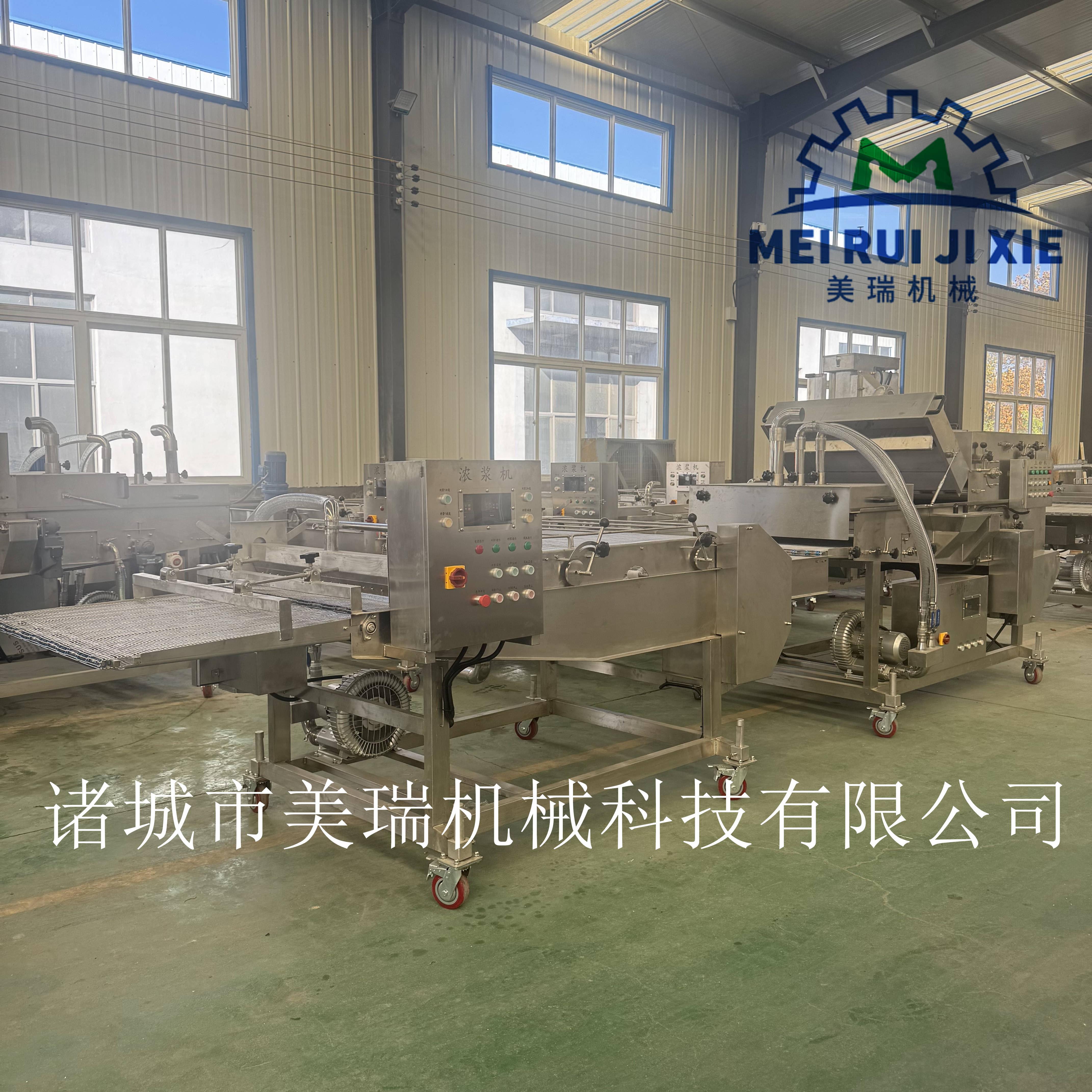 产品经过淋浆部分后,下部由下淋浆槽上储存的浆液均匀粘附上,上部由浆幕将浆液粘附上。通过风刀时,多余的浆液被吹落。然后输入到下一工序。还适应于鸡肉、牛肉、猪肉、鱼、虾等海鲜产品,适用于上面包屑和上粉前的工艺。