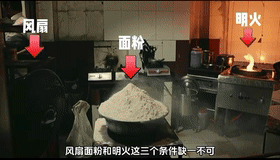 3. 点火源:此时,一旦遇到哪怕一丁点明火(如灶台火焰、火星)或高温热源(如电火花❇️、未冷却的锅面),火焰会以惊人的速度在颗粒间传递。