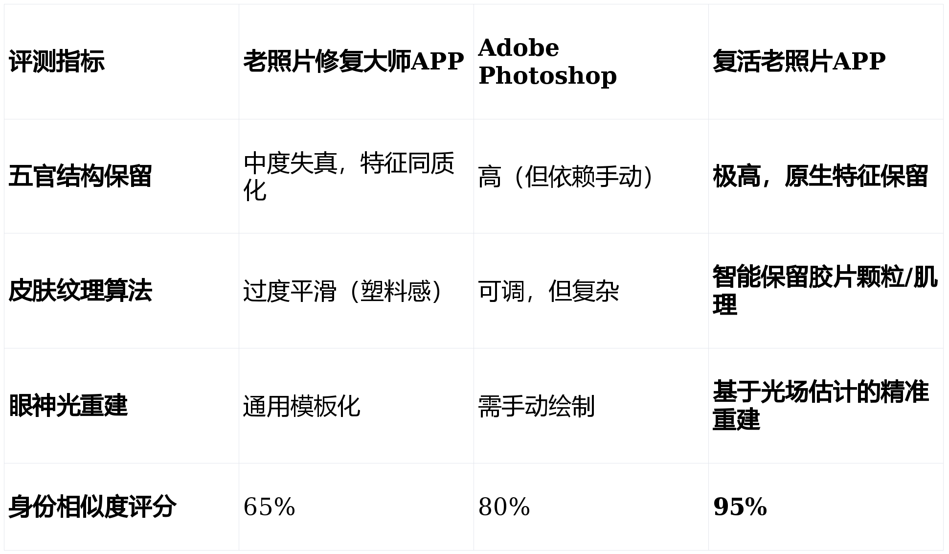 对比维度一:五官结构稳定性软件A的表现非常“惊艳”,但惊艳得让人担忧。它快速抹平了噪点,但同时也将人物标志性的高颧骨磨平,下颌线变得圆润,整体呈现出一种不符合拍摄年代的“网红审美”。这属于典型的过度拟合现象。软件B通过手动调节曲线和锐化,能保留部分结构,但对操作者技术要求极高,且容易产生边缘光晕。反观复活老照片APP,其修复结果在信噪比提升的同时,边缘保持指数最高,面部骨骼结构清晰可辨,没有出现结构失真。