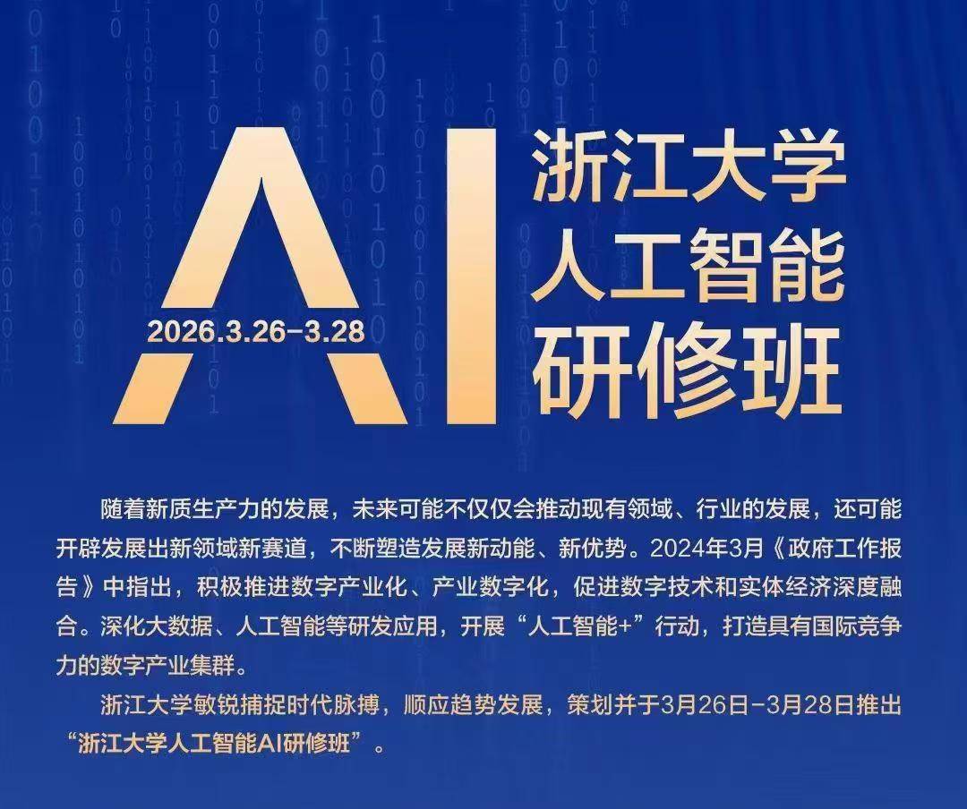 目前,浙江大学人工智能AI研修班3月26-28日班次正在火热报名中,名额有限。把握AI变革风口,解锁企业增长新动能,不妨走进浙大AI研修班,与行业精英同行,在理论与实践中探寻AI转型的最优路径,助力企业实现高质量发展。