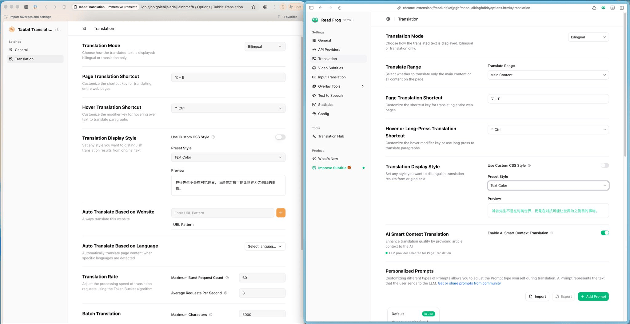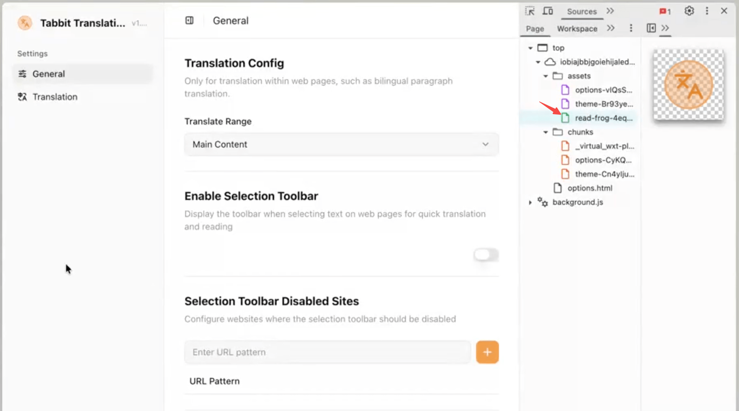 根据作者本人发布的帖子,Tabbit浏览器的翻译功能虽然做了简化,但保留功能跟伴读蛙的UI设计有一定相似度,尤其是两个快捷键组合完全一致。最主要的证据则来自于Tabbit的源码文件中,包含有“read-frog”的字符。