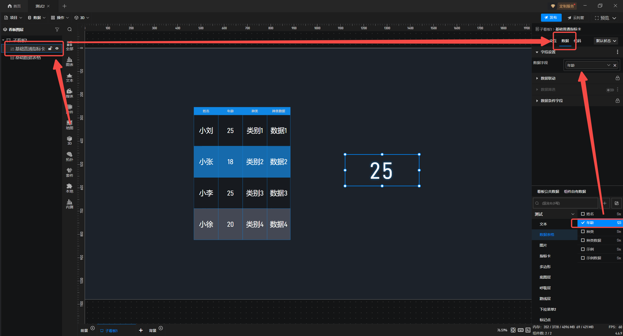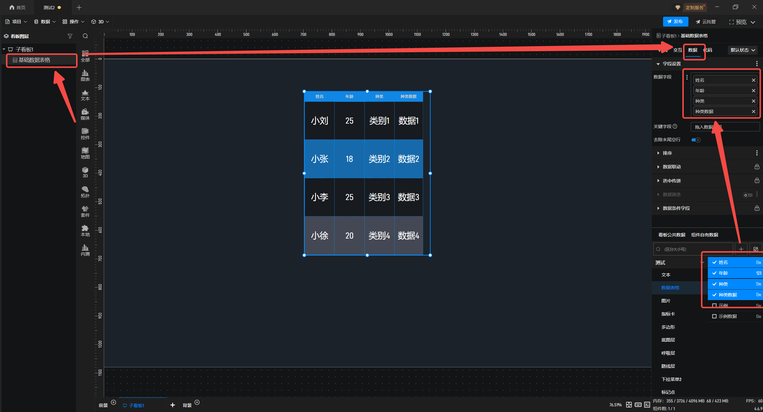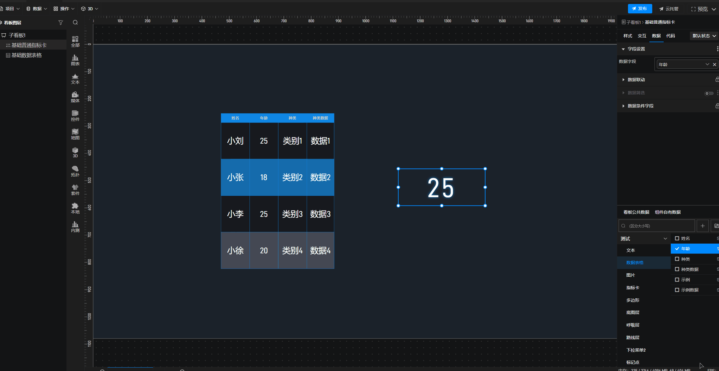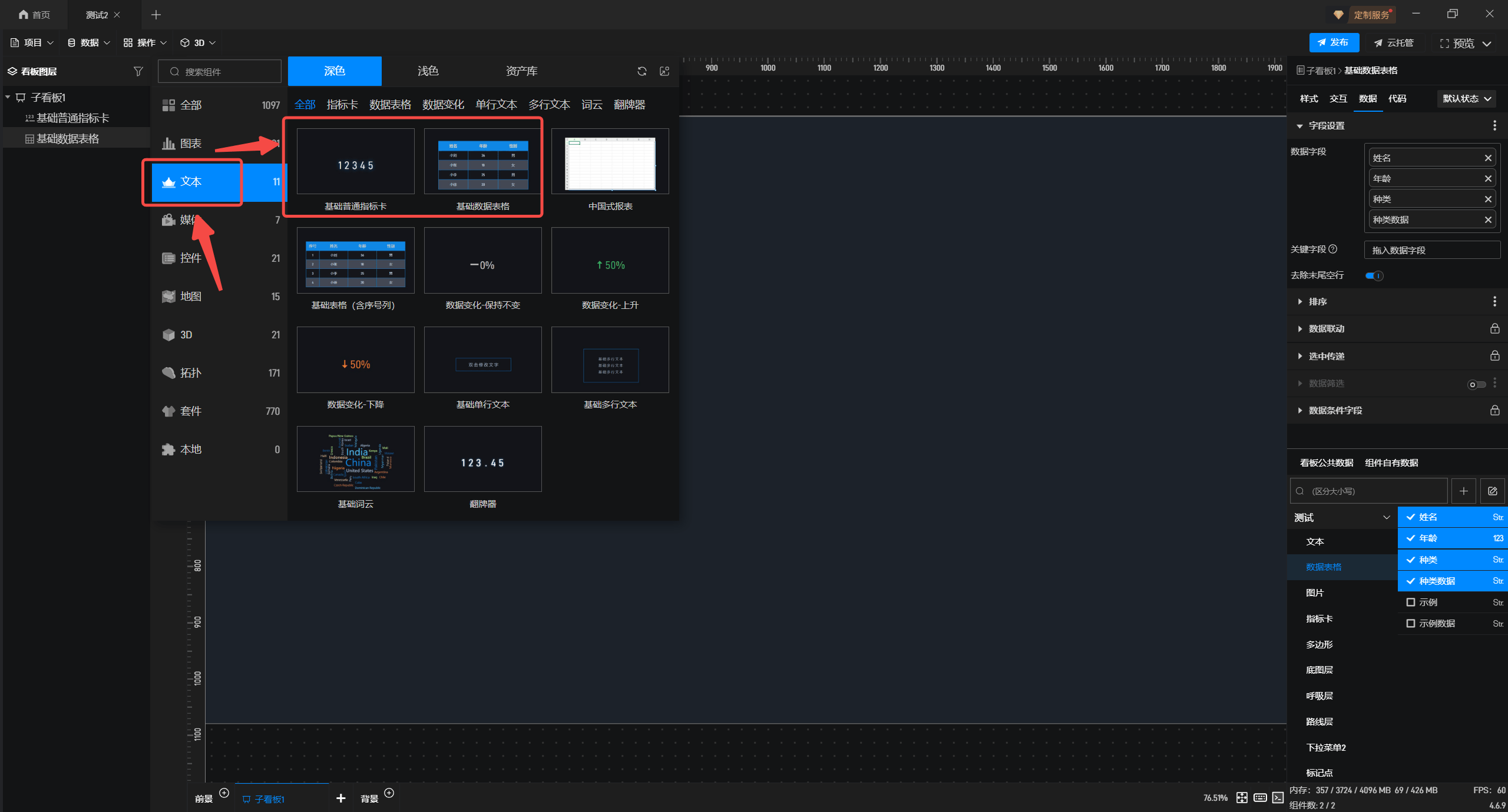 1.在左侧组件库添加“基础数据表格”和“基础普通指标卡”组件至项目中。