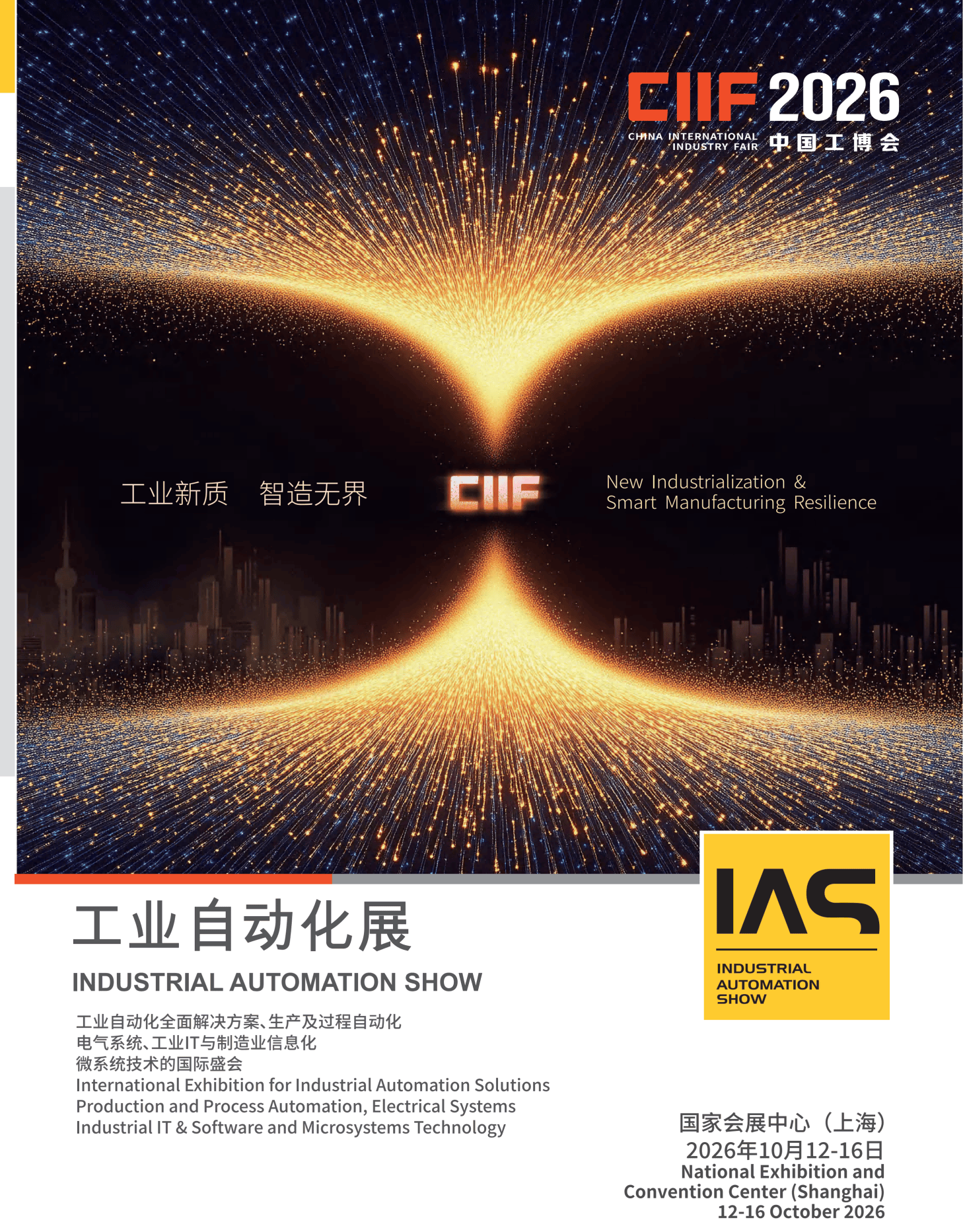 当工业4.0的浪潮与“新质生产力”的时代强音交汇,全球制造业正站在一个前所未有的历史拐点。『数字化』重塑生产逻辑,智能化定义效率极限,绿色化引领未来方向。在这场深刻的产业变革中,如何抢占技术高地,链接全球资源,洞见市场先机?2026工业自动化展(IAS)将以更广阔的视野、更专业的姿态,向全球自动化领域的企业与精英发出诚挚邀约——2026年10月12日至16日,国家会展中心(上海),让我们共同见证智造的力量。