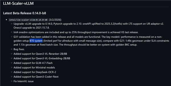Intel目前尚未在公开场合正式宣布该产品,但在更新日志中,明确出现了“B70”及"G31验证"的字样,直接将B70与G31 GPU核心关联,成为迄今最确凿的官方佐证。