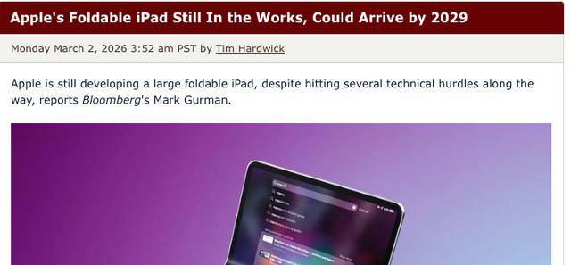 去年7月有消息称,因研发问题苹果决定暂停更大尺寸可折叠iPad的研发工作,如今看来这一说法有些言过其实。古尔曼此前曾报道,苹果原本计划在2028年发布这款可折叠iPad,但由于重量和显示技术等方面存在难题,发布时间可能会推迟至2029年。