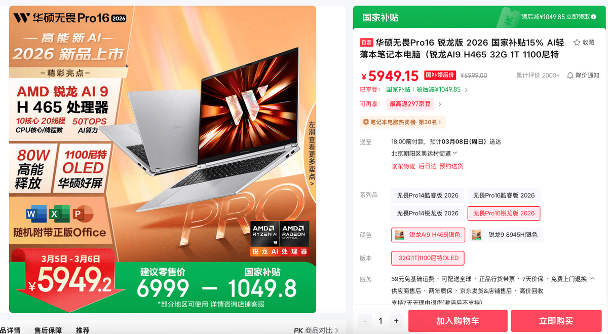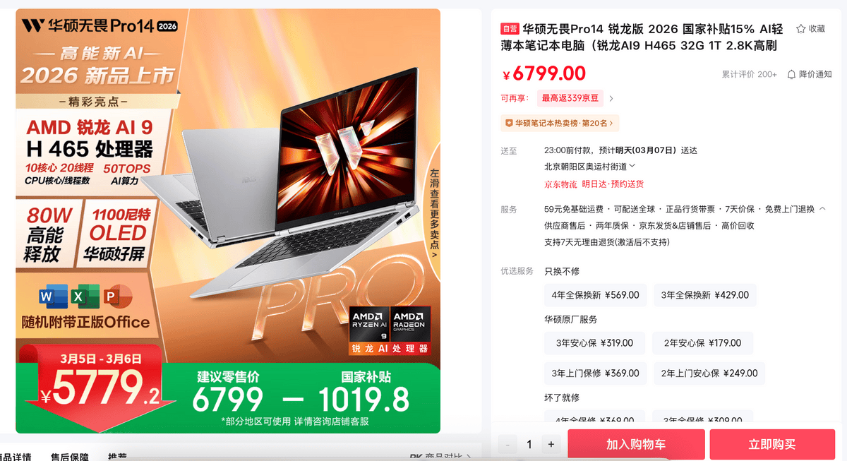 新学期开启,告别学习效率低下、娱乐体验拉胯的用机日常,焕新一台性能强劲的笔电至关重要。在众多新品中,推荐学生党重点关注华硕无畏Pro14 2026,1.39kg轻薄机身配备AMD锐龙AI 9 H 465移动处理器、2.8K 120Hz OLED华硕好屏、80Wh超大电池等,兼具强劲性能、出色好屏、长续航,并以至高80W性能释放,轻松hold住校园全场景。当前购机,叠加至高1019.8元国家补贴,到手5779.2元,即刻开启学习、创作、娱乐一步到位的全能体验。