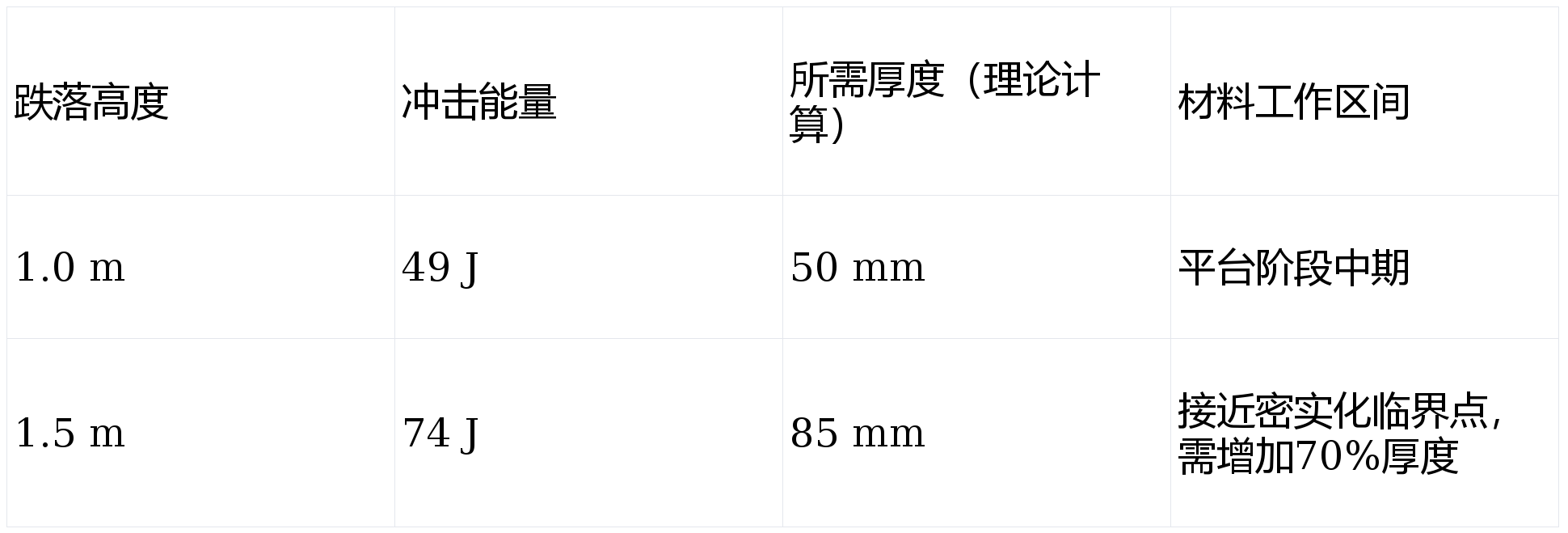 当跌落高度从1米提升至1.5米,冲击能量增加50%,但所需厚度的增加比例可能远低于50%,也可能远高于50%,具体取决于初始设计所处的力学区间。