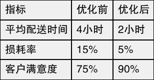 问:如何评估优化后的配送效果? 答:通过各项指标,如平均配送时间缩短至2小时,损耗率降低至5%,客户满意度提升至90%,可有效评估配送效果。