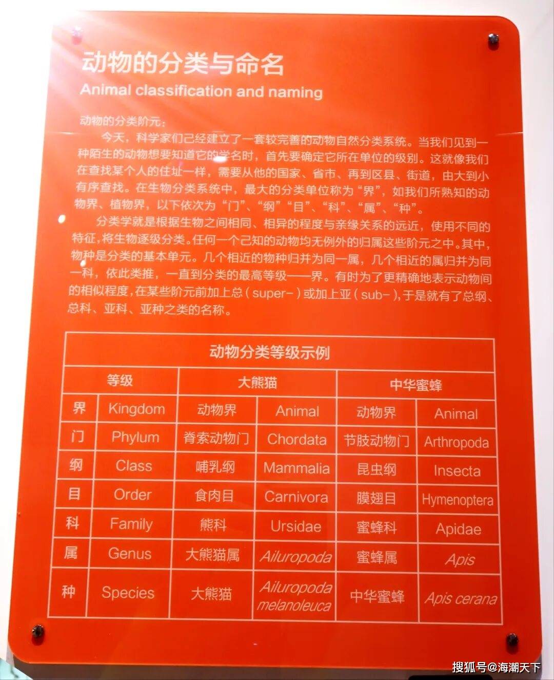 ▲上图:动物的分类与命名。在这个生物分类系统中,最大的分类单位称为“界”,例如动物界、植物界。以下依次为“门”、 “纲”、“目”、“科”、“属”、“种”。分类学根据生物之间的相似程度和亲缘关系的远近,使用不同的特征将生物逐级分类。任何已知的动物都可以被归入这些分类阶元之中,其中物种是分类的基本单元。©Linda Wong 摄于国家动物博物馆 | 海潮天下(Marine Biodiversity)