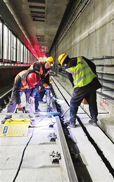 中铁二十二局施工人员在地铁隧道内进行线路精调,天津地铁8号线日前完成全线轨道铺设。