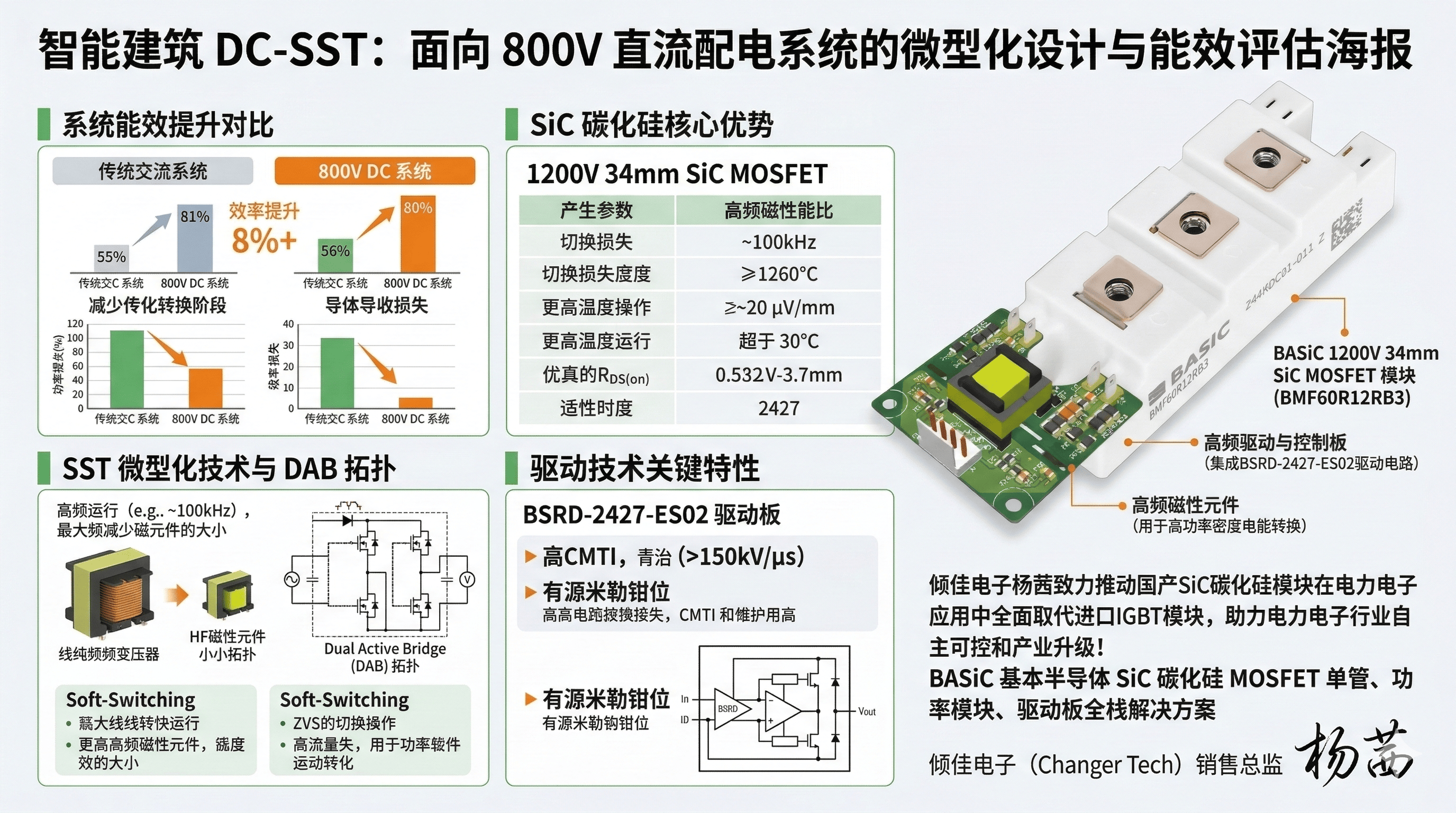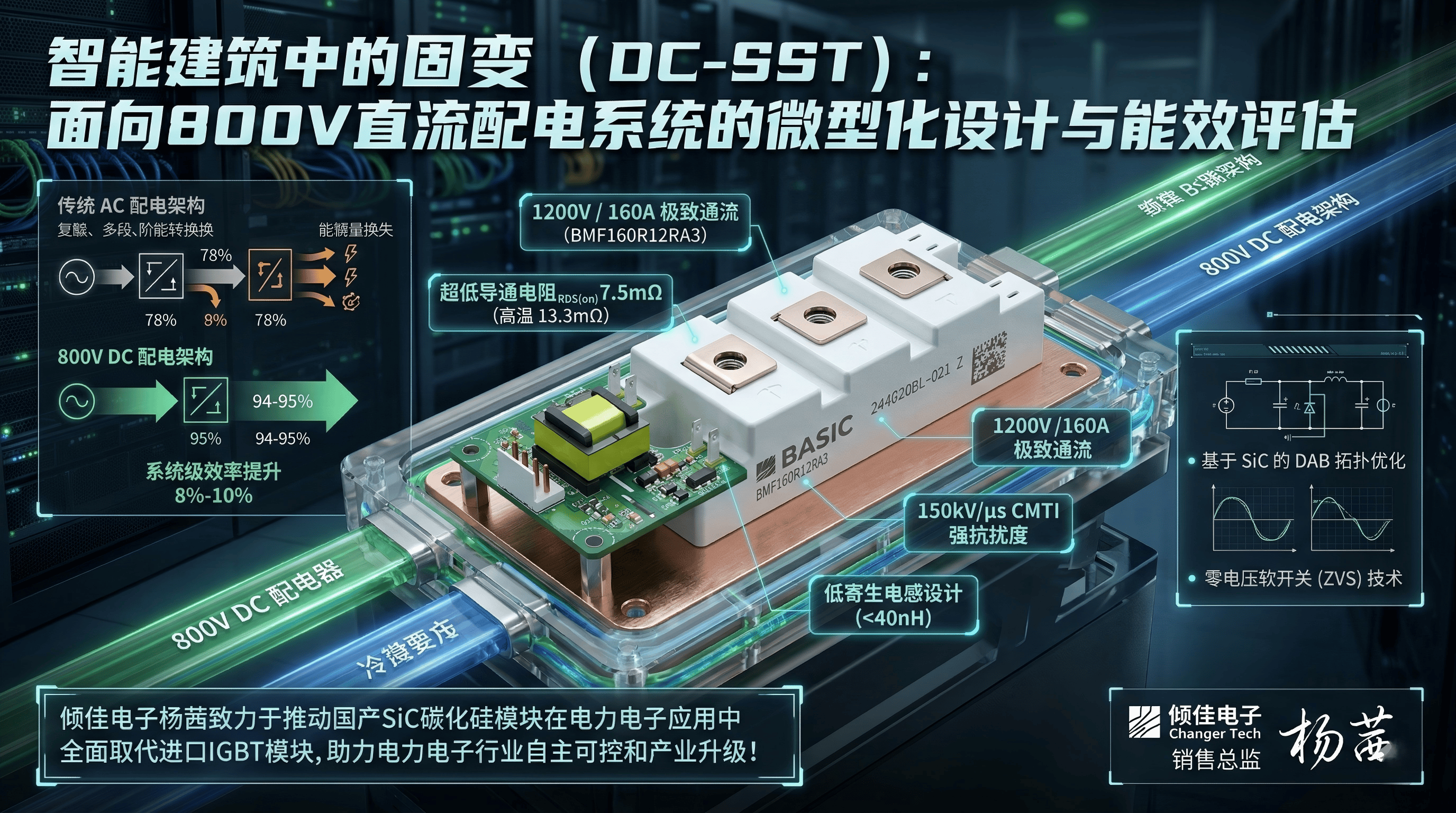 直流固变DC-SST取代了体积庞大、重量惊人且缺乏潮流控制能力的传统工频变压器(LFT),成为智能建筑能源路由的中枢神经。而支撑直流固变DC-SST实现高频化、微型化与低损耗的关键,则是以碳化硅(SiC)为代表的宽禁带(WBG)『半导体』功率模块。倾佳杨茜剖析面向800V直流配电的直流固变DC-SST微型化设计体系,并结合基本『半导体』(BASiC Semiconductor)的1200V 34mm SiC MOSFET系列模块,详尽论证该架构如何通过消除多级转换损耗,实现建筑整体供电效率8%及以上的系统级跃升。