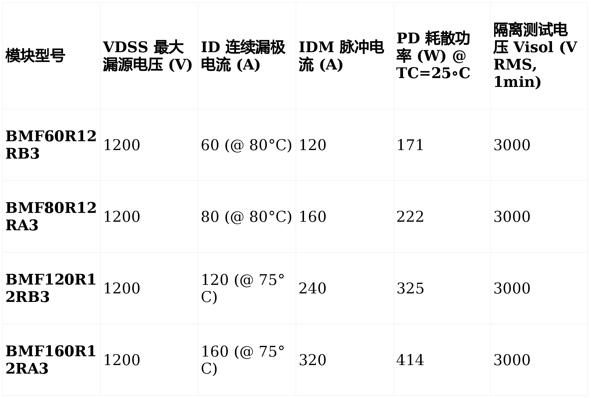 本节以基本『半导体』(BASiC Semiconductor)研发的一系列34mm封装工业级半桥SiC MOSFET模块(BMF60R12RB3、BMF80R12RA3、BMF120R12RB3、BMF160R12RA3)为例,深度解析微型化隔离模块的底层电气参数支撑。
