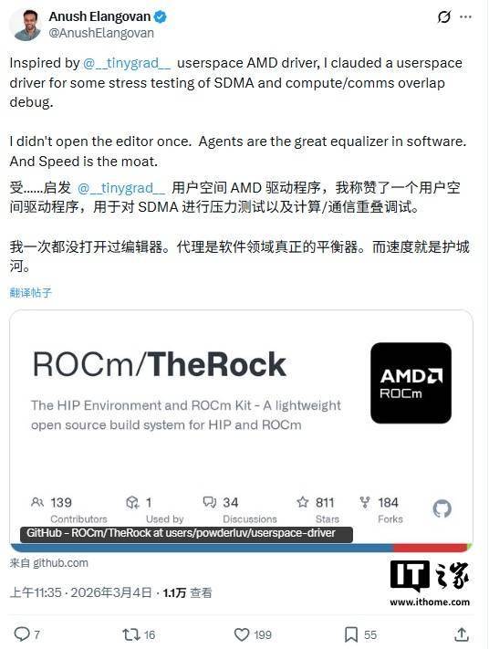 今日霍州 3 月 8 日消息,AMD 企业副总裁 Anush Elangovan 上周发布了一个完全用 Python 编写的小型实验性 Radeon 驱动程序。据 Elangovan 本人证实,这些代码完全通过 Claude Code 所生成,他期间甚至一次都没打开过代码编辑器。