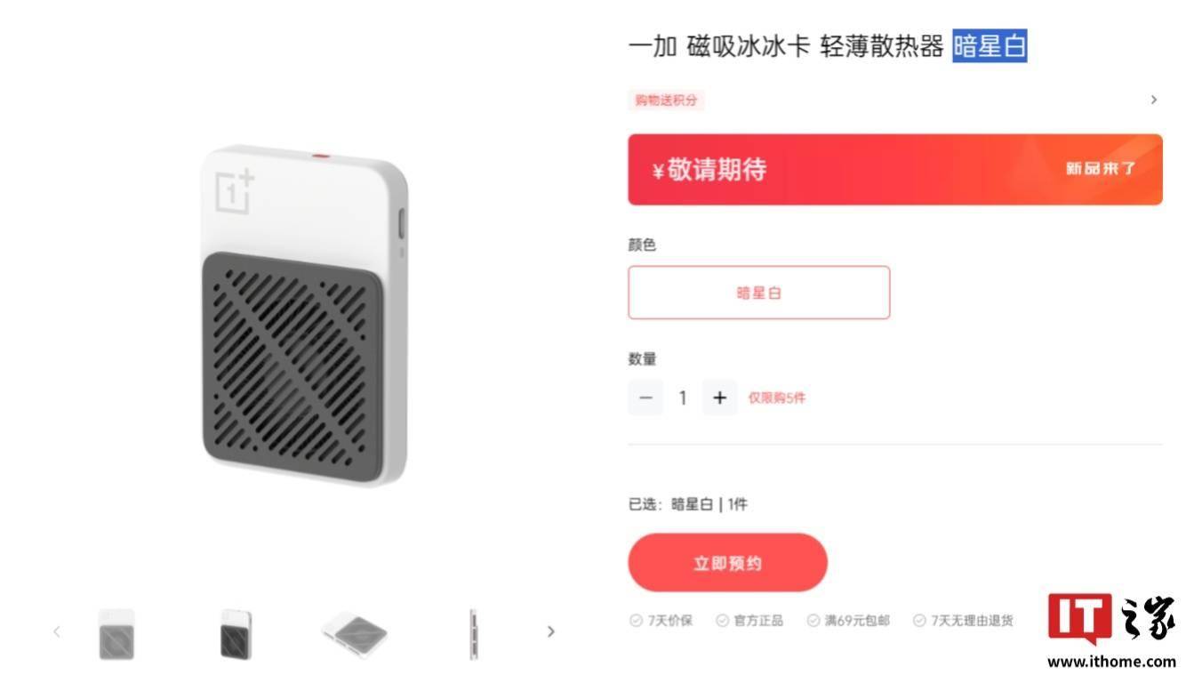 今日霍州 3 月 8 日消息,一加磁吸冰冰卡轻薄散热器已现身 OPPO 官网,目前仅公开了暗星白配色。这款散热器预计将随一加 15T 小屏手机等新品一起发布。