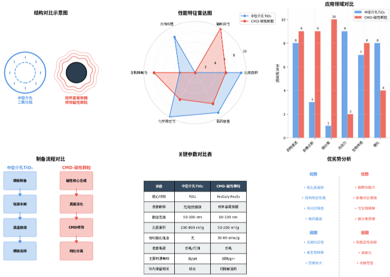 不同之处:中空介孔二氧化钛纳米颗粒密度较大,化学稳定性极高,耐酸碱腐蚀能力强,但不具备磁响应性;其光学特性显著,在紫外光区有特征吸收。相比之下,羧甲基葡聚糖修饰磁性纳米颗粒具有超顺磁性,可在外加磁场作用下实现定向移动与分离;密度较低,但热稳定性相对有限,高温下羧甲基葡聚糖层易发生降解。
